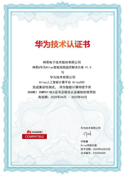 4月3日,神思電子智能視頻監(jiān)控方案順利完成華為技術(shù)有限公司Atlas人工智能計算平臺Atlas500兼容性測試,獲得了HUAWEI COMPATIBLE證書及相關(guān)認(rèn)證徽標(biāo)的使用權(quán),標(biāo)志著神思電子正式加入華為昇騰生態(tài),未來雙方將共同進(jìn)行智能視頻監(jiān)控解決方案的推廣,為行業(yè)客戶提供技術(shù)保證。