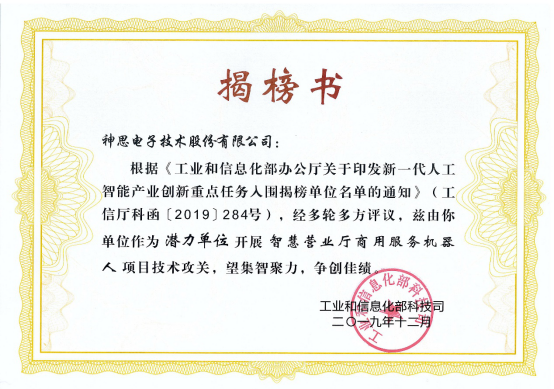 近日,工業(yè)和信息化部辦公廳印發(fā)“新一代人工智能產(chǎn)業(yè)創(chuàng)新重點任務入圍揭榜單位名單”,山東省共8家企業(yè)入圍重點任務榜單,神思電子獲批潛力單位,開展智慧營業(yè)廳商用服務機器人項目技術(shù)攻關。