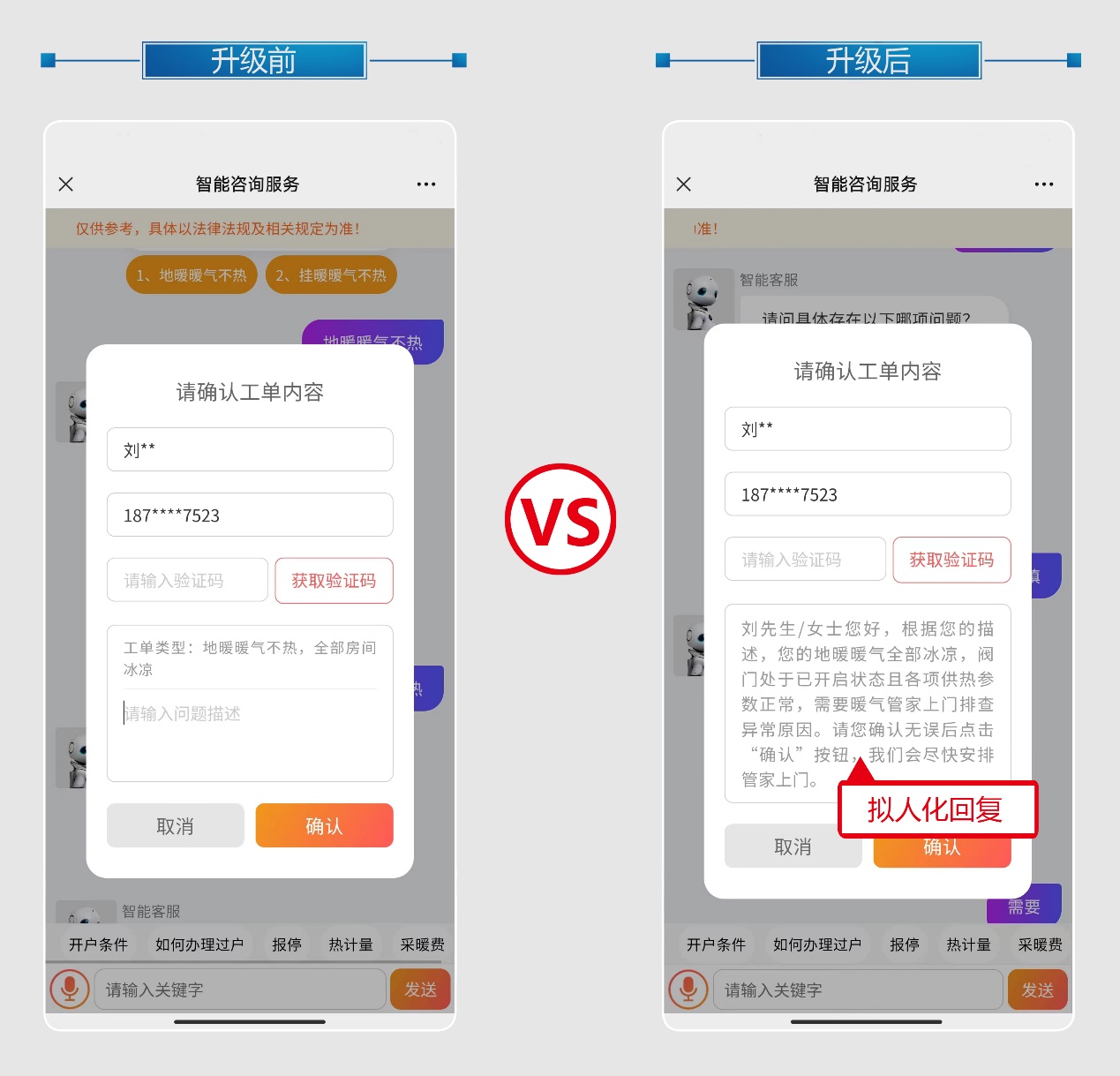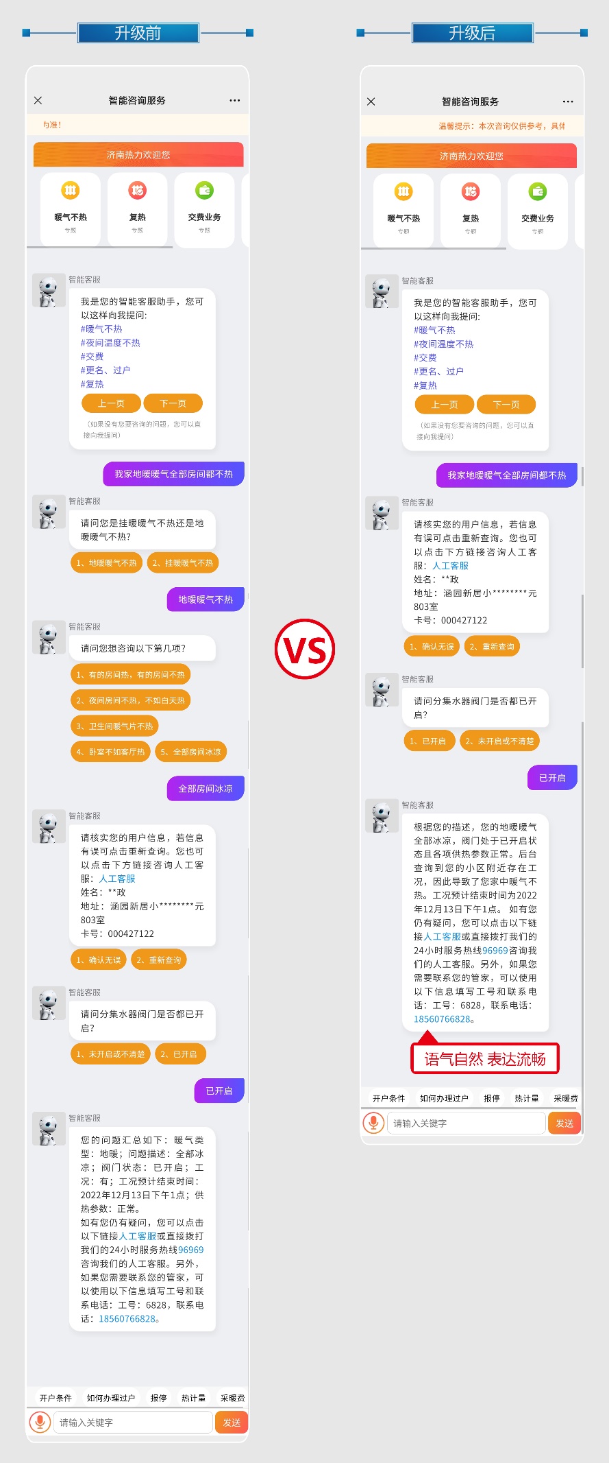 語(yǔ)言模型融合內(nèi)容生成技術(shù),綜合上下文內(nèi)容、客戶用熱情況、管網(wǎng)運(yùn)行狀態(tài)等信息,生成擬人化回復(fù),使交互更加自然流暢。